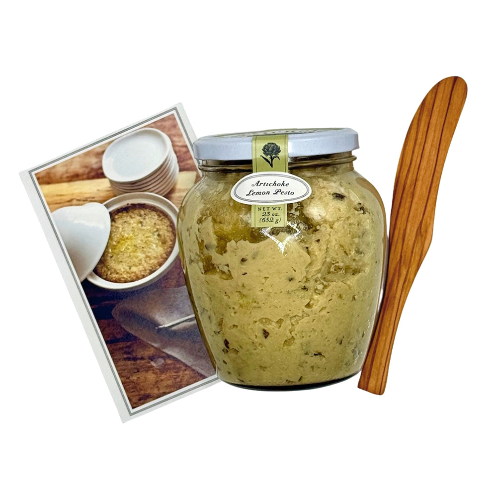 What's Included: Artichoke & Lemon Pesto (17oz), Olive Wood Spreader, and Warm Artichoke Dip Recipe Card.